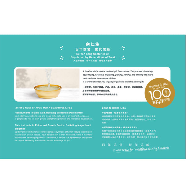A bowl of thick bird’s nest is nutrient-dense. With high-quality translucence, it offers diners a mouthfeel of smoothness and springiness. The century-old Eu Yan Sang has stood the test of times and is known for its quality and naturalness. Produced with the latest manufacturing technologies, every bowl of Eu Yan Sang’s bird’s nest is rich in sialic acid and fresh nutrients. The scientifically-defined processing time secures the freshness of natural nutrients.
